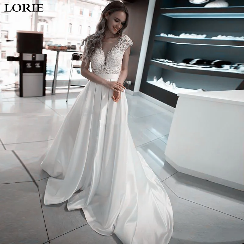 Excellent LORIE Prinses Trouwjurken Satin Vintage Top Lace Wedding Bruid Jurken Open Back Wit Ivoor Boho Bruidsjurken Where Can I Buy