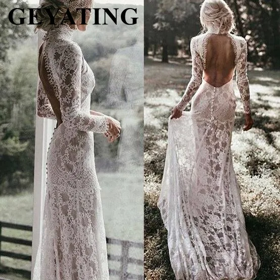 ^Cheap Vintage Ivoor Kant Mermaid Bohemian Jurk Lange Mouwen Romantische Hoge Hals Open Back Boho Strand Trouwjurken 2020 Nieuwe