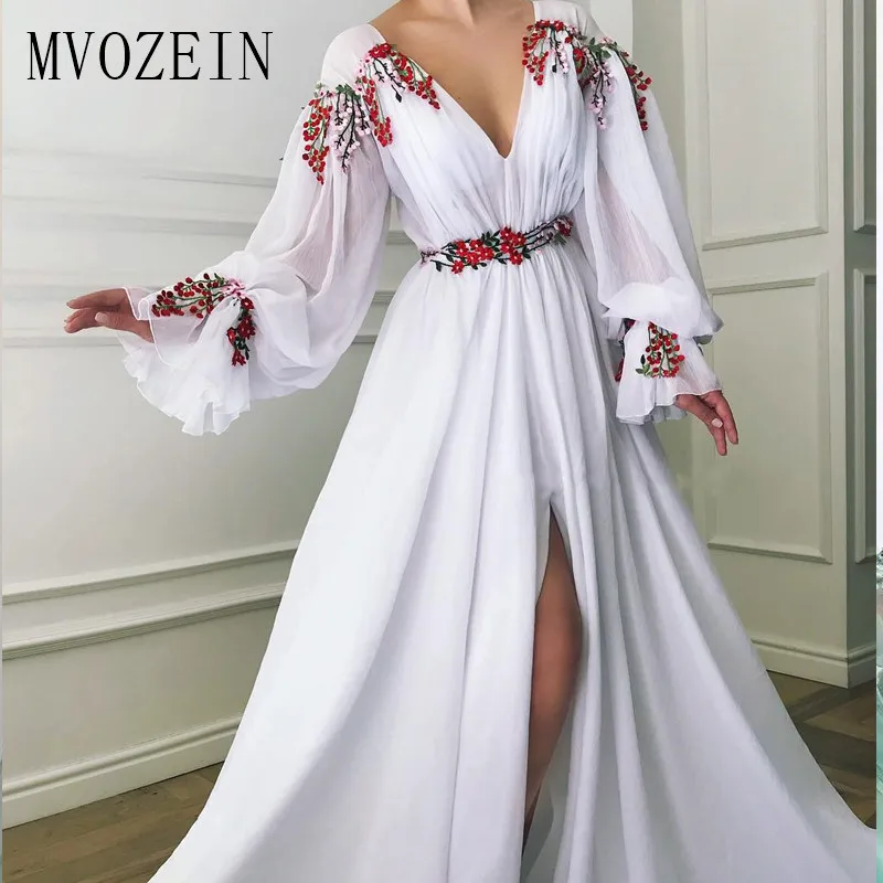 Very Good 2019 Hot White Avondjurken Chiffon A-lijn V-hals Mouwen Hoge Split Lange Avondjurk Formele Prom Party Dress Low Cost