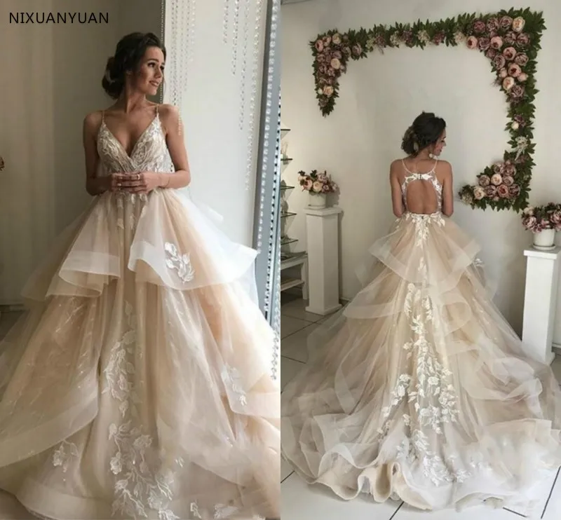 Very Good 2020 Champagne Elegant Een Line Spaghetti Kant Trouwjurken Tiered Ruffle Vloeiende Lace Applique V-hals Bridal Bruidsjurken Buying