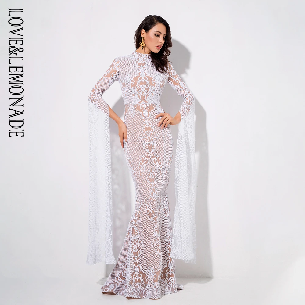 Very Good Liefde And Limonade Wit Geometrie Kraag Kraag Uitlopende Lange Mouwen Glitter Materiaal Lange Jurk LM1039 The Cheapest Online
