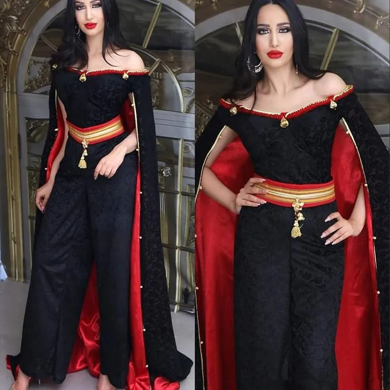 Very Good Rood Zwart prom Formele Jurken met cape 2020 arabisch Jumpsuits Jurk Avondkleding Midden-oosten Dubai Abaya Kaftan Kleider gewaden de Sale