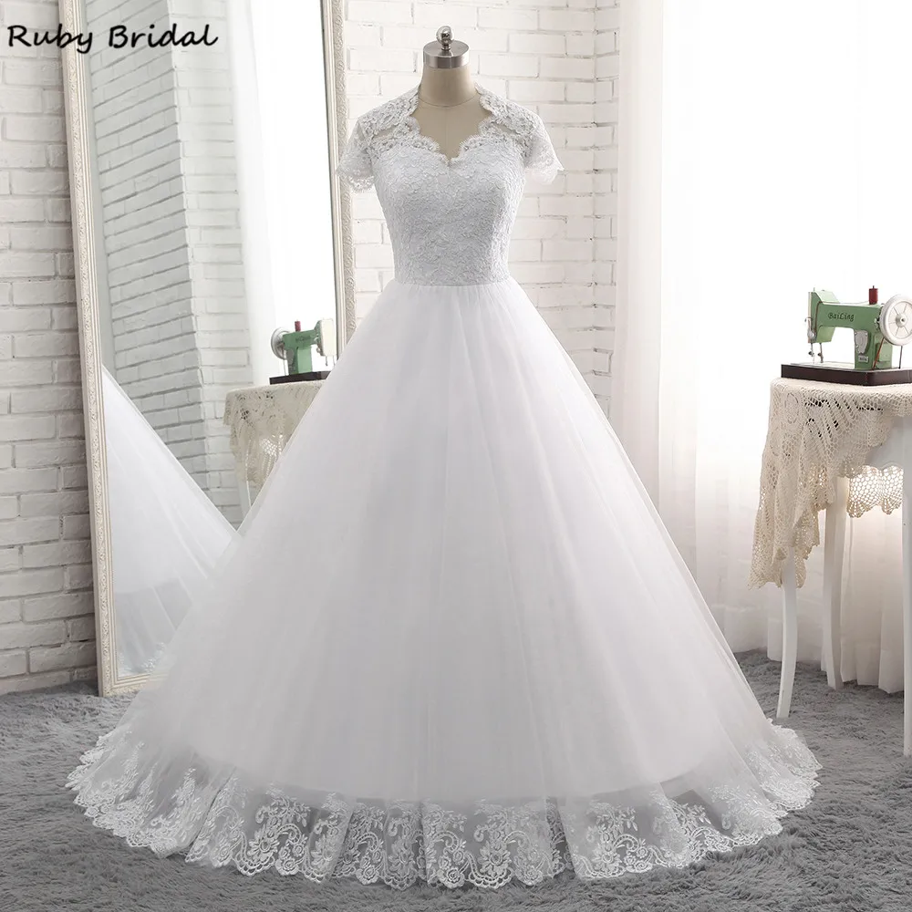 Very Good Ruby Bridal 2017 Elegant Vestido De Noiva Lange A-lijn Trouwjurken Goedkope Wit Tulle Applicaties Korte Mouwen Bruidsjurk PW7 Buying