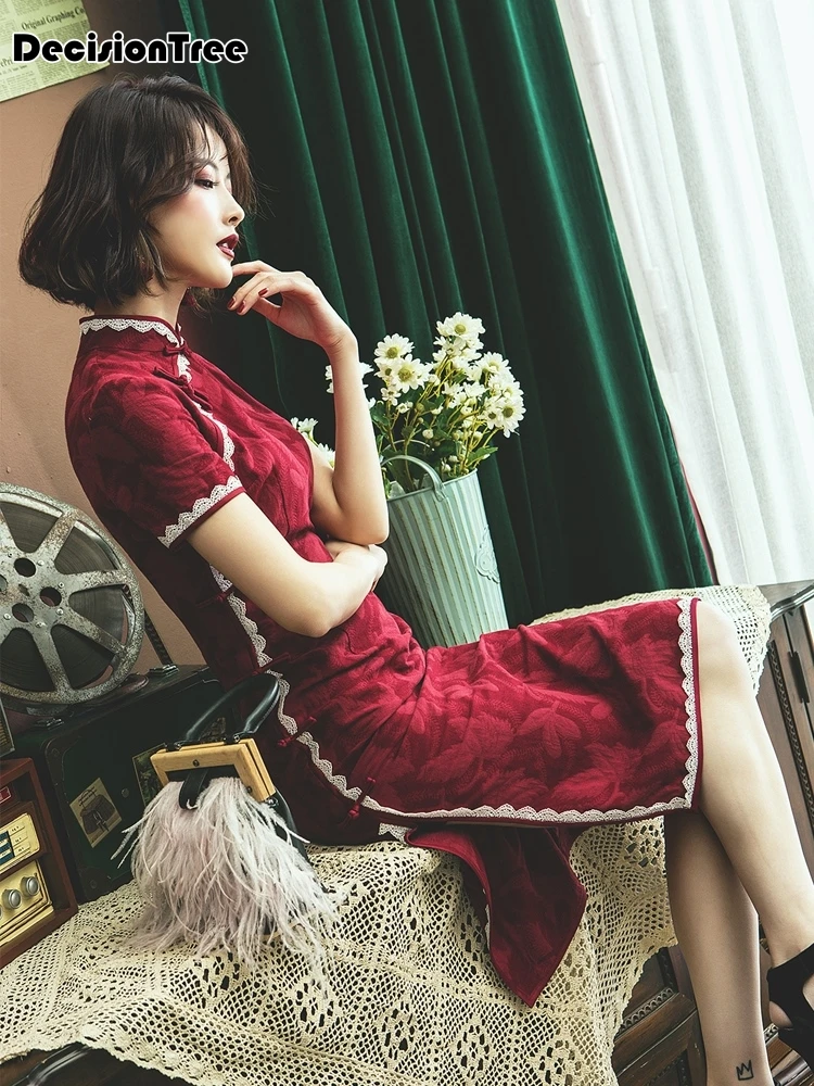 Very Recommended 2020 Chinese Jurk Qipao Satijn Robe Rode Avond Cheongsam Jurken Kant Borduurwerk Traditionele Vintage Qipao Bruiloft Cheongsam Online