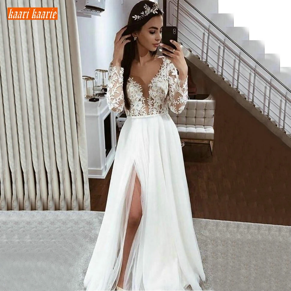 Very Recommended Elegante Boho Tulle White Wedding Dresses Lange Mouwen Kant Applicaties Side Slit Bruidsjurken Ivoor Land Strand Sedding Jurk Nieuwe Buying