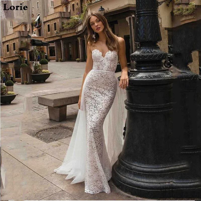 ^*Best Offers LORIE Kant Mermaid Bridal Dress Applicaties Mouwloze Beach Wedding Jurken Vintage Afneembare Trein Turkije Wedding Gown