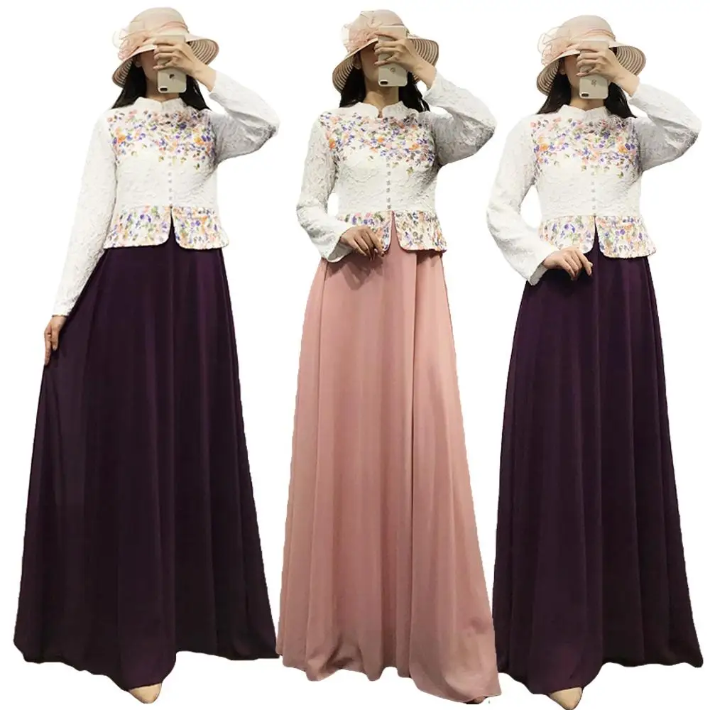 Wonderfull Moslim Elegante Vrouwen Maxi Jurk Print Bloem Kant Tops + Chiffon Rok 2 STUKS Kaftan Gewaad Elegante Islamitische Arabische Kleding 2019 Fashion Price Compare