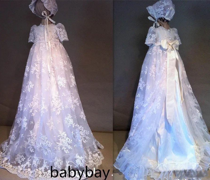 Wonderfull Wit/Ivoor Kant met Bonnet Baby Meisjes Lange Chirstening Gown Aangepaste Doop Jurk Elke Grootte Who Sells The Cheapest
